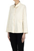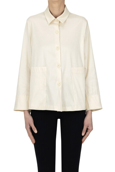 Shantung style fabric boxy shirt jacket, collar, pockets at front.