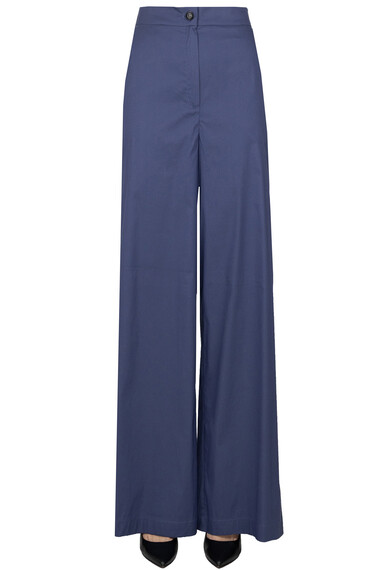 Lightweight cotton-blend trousers, wide leg trousers, zip-fastening and button-fastening at front.