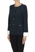 Cardigan giacca in maglia lavorata, bottoni in metallo dorato, polsini a contrasto.