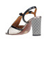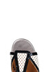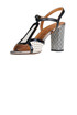 Sandali Bechill in pelle traforata con dettagli in vernice, cinturino a T, tacco rivestito.