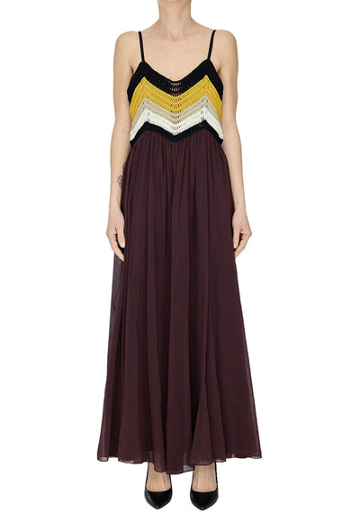 Abito con top crochet e gonna a contrasto, bottoni posteriori, interno foderato.