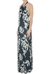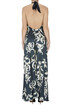 Abito sottoveste in satin jacquard stampato, scollatura all'americana con fiocco da annodare dietro il collo, schiena scoperta, spacchi laterali.