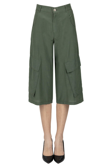 Bermuda stile cargo in seta e cotone, chiusura con zip e bottone frontale, tasconi laterali.