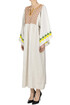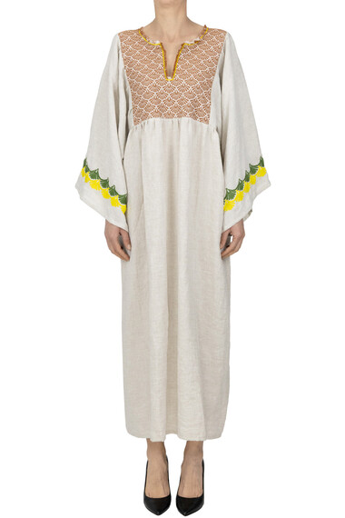 Abito lungo in lino e cotone ricamato, scollatura sfrangiata, ampie maniche a 3/4.
