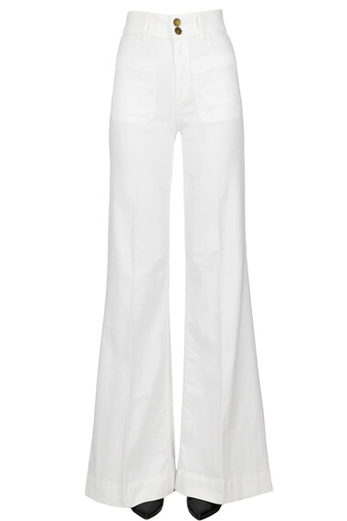 Jeans Jean a palazzo, gamba svasata, zip e bottoni frontali, tasche frontali, tasche posteriori.