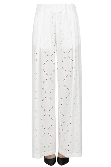 Pantaloni in sangallo con pinces frontali, elastico in vita.
