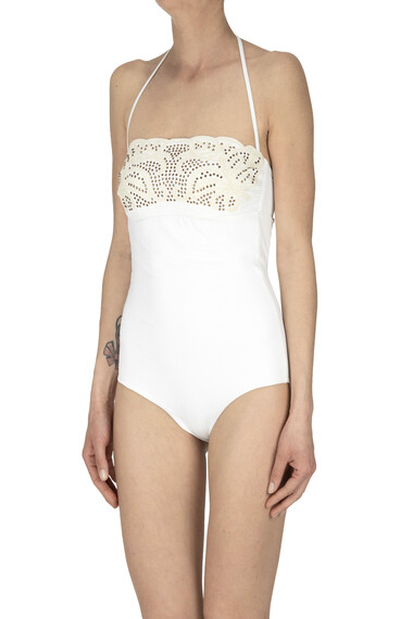Costume intero a fascia con strass e ricami .