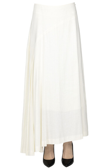 Gonna midi in rayon e lino, asimmetrica, zip laterale, interno foderato.