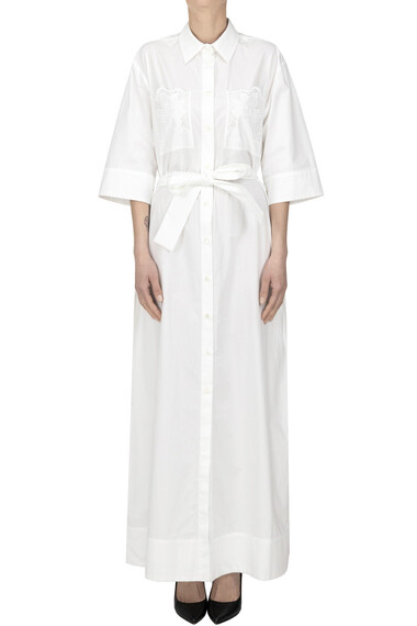 Embroidered chest pockets cotton long shirt dress, collar, button-fastenings at front, self-tie waistbelt.