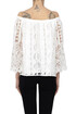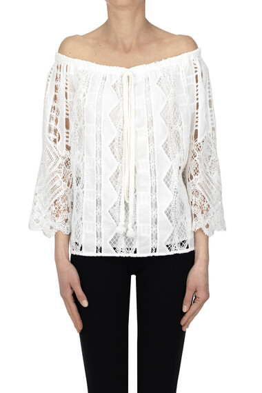 Notorius cotton lace wide blouse, elasticated wide neckline with drawstring, lined interior.