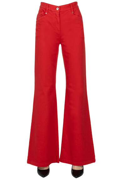 Laura 5 pockets denim trousers, flared wide leg, zip-fastening and button-fastening at front.